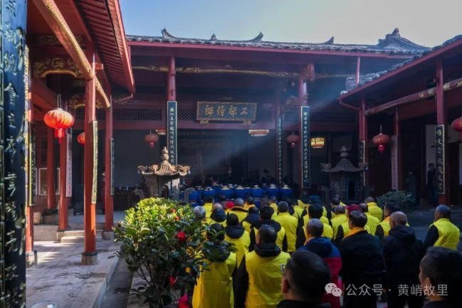 黄传兴宗长主持祭祀仪式。他高喊:“上香”,宗亲们手持三炷清香,向着峭山神像行三拜礼。 随后是传统的敬献礼环节。代表二十一子的主祭人员在司仪引导下,依次敬茶、敬酒、献三牲、五果、糕点等,宗亲们紧随其后,依次行敬献之礼。 伴随着悠扬的《黄氏祖训歌》,黄维基宗长恭读祭文颂扬峭公“诗礼传家、开拓四方”的丰功伟绩, 最后,参加祭祀的宗亲行三跪九叩大礼,“一叩首、再叩首、三叩首……九叩首”,宗亲们的每一次叩首都饱含着对先祖的无限追思与敬仰。